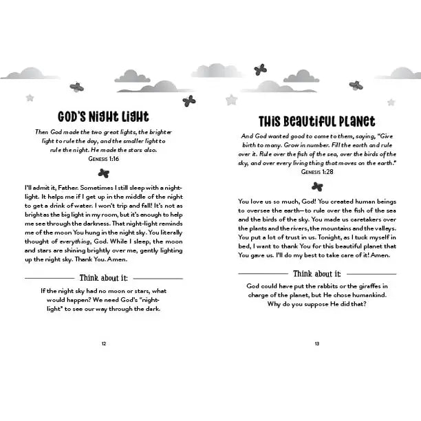 Each of these 180 prayers address important issues of life common to all girls—such as knowing God, trusting God, making good choices, being courageous, and more. Just 3 short minutes, and girls will be on their way to a peace-filled sleep!