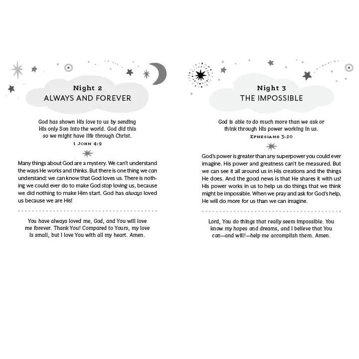 In just 3 easy steps—1) meditate on a brief, but powerful, scripture selection; 2) read through a relevant devotion; 3) start a conversation with God by reading a heartfelt prayer—girls will be encouraged and motivated to grow in their faith. Bedtime will become peaceful and comforting—the very best time of the day!—with these truth-filled devotions and prayers!