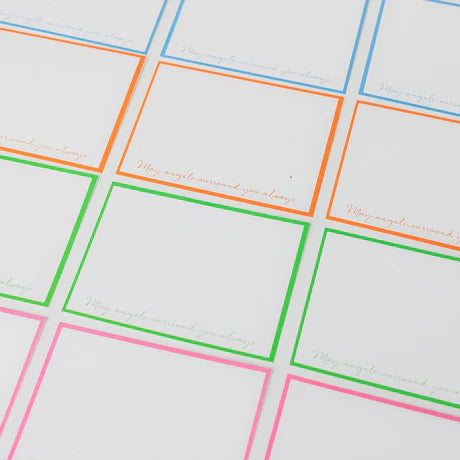 Whether you are sending a note of congratulations, encouragement or sympathy, our May Angels Surround You Always notecards are perfectly designed in their simplicity and are ideal for sharing your thoughts with beauty and flair. These notecards are available in green, pink, orange or blue. Each comes with matching envelopes featuring Anne Neilson’s artwork printed inside.