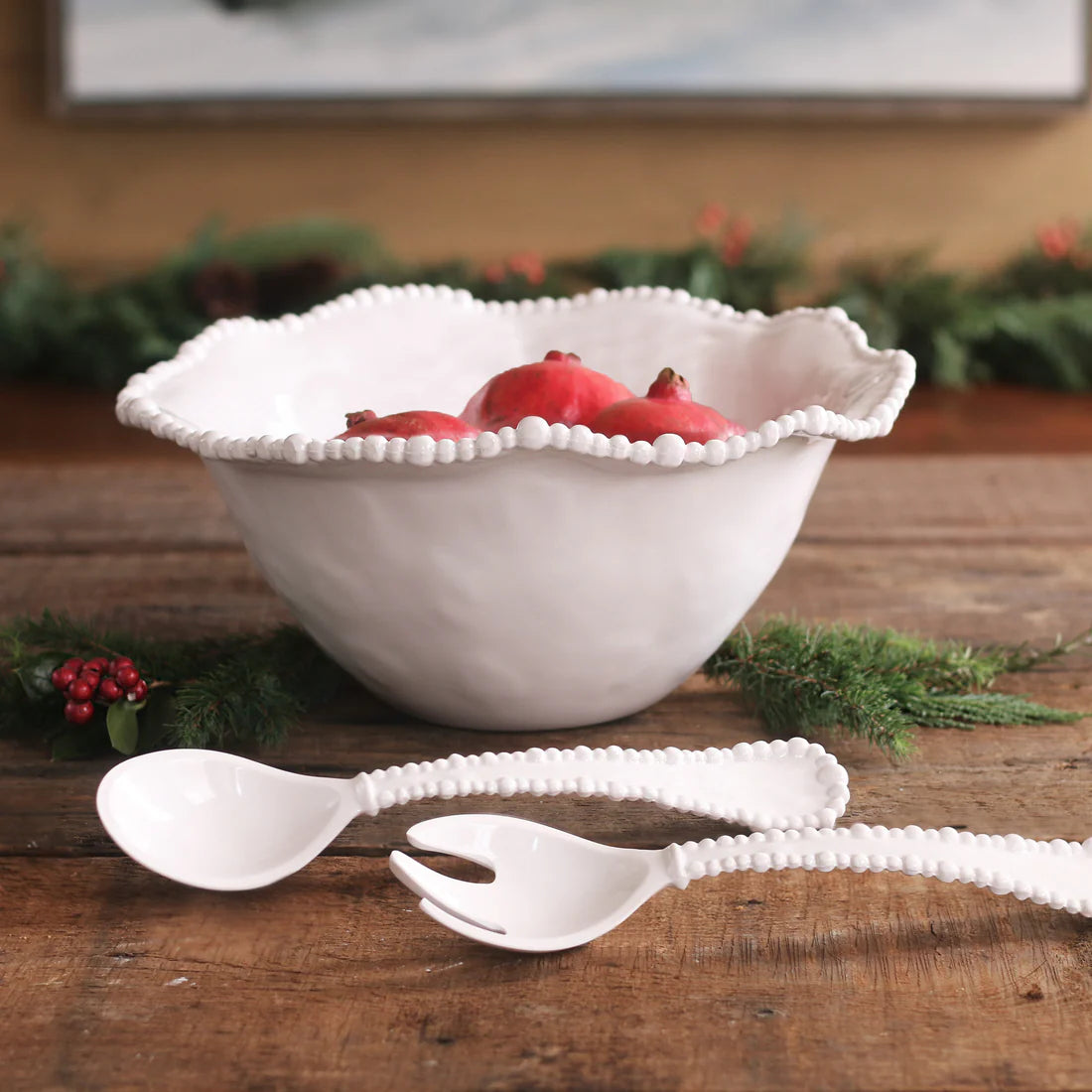The VIDA Alegria Large Bowl (White) is a serving essential from the popular Alegria Collection, a high-end melamine line designed with distinctive Beatriz Ball flair. Featuring a pearl rim, it is a natural for fruit, salads and chips. This generous bowl has the substance, weight and appearance of a ceramic piece, but is made of luxury melamine for everyday enjoyment. Perfectly suited for indoor and outdoor entertainment, Alegria is a collection as joyful as its name. Mix and match with other melamine items for a vibrant tablescape, or pair with our small white bowl for a great chip and dip set. Matching salad servers available. Dishwasher safe (top rack), heavy-weight, food safe, BPA and PABA free.