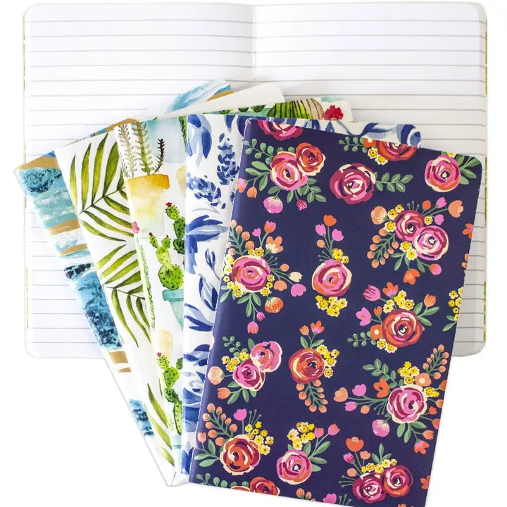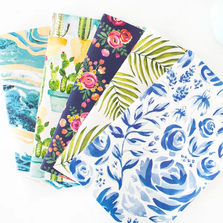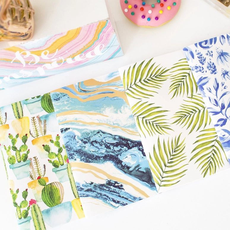 Discover the stylish and functional Mini Lined Notebook Set, each measuring 5.5" x 3.5". With designs including colorful and fun designs, these notebooks offer 56 pages of high-quality 100gsm lined paper. Durable with a smooth finish, they also feature a premium singer-sewn binding for a touch of elegance. Perfect for all your note-taking needs and for on the go! • Each notebook is 5.5” x 3.5”. • Designs include vintage floral, palm leaves, cacti, blue floral, geode with gold foil stamping. • 56 pages of bright white 100gsm blank lined pages per notebook. • Blank lined frames on matte inside covers allow you to put your personal information and/or label each notebook’s special purpose. • Special rubber film lamination makes notebooks durable with smooth and soft finish. • Premium singer sewn binding.