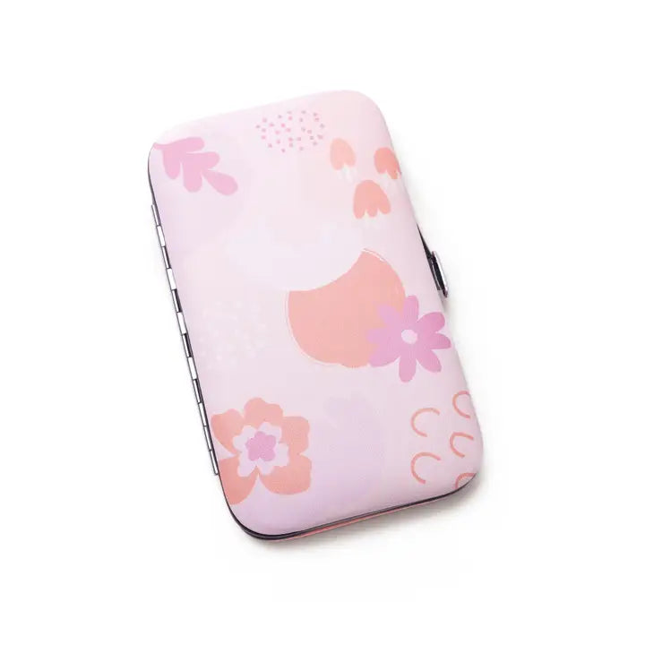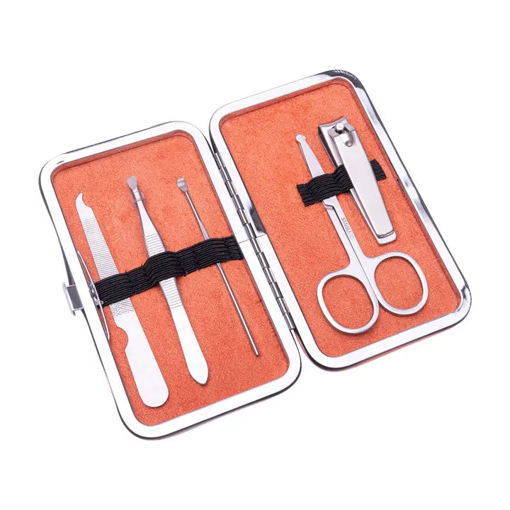 Manicure set with 5 stainless steel tools (nail file, tweezers, cuticle tool, nail clippers, cuticle scissors) in a durable PU case. Stylish and portable for on-the-go use.