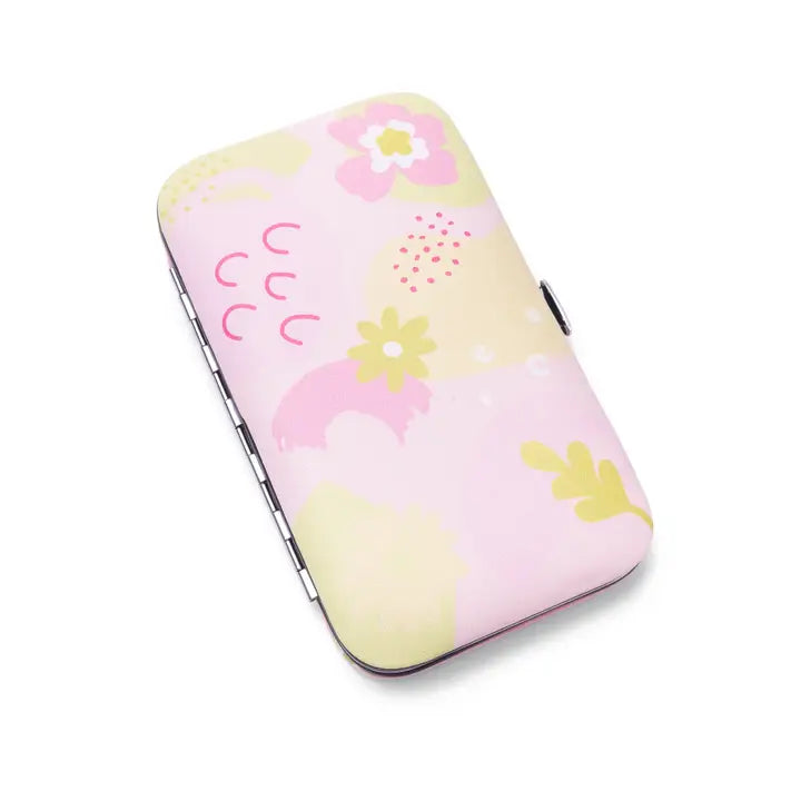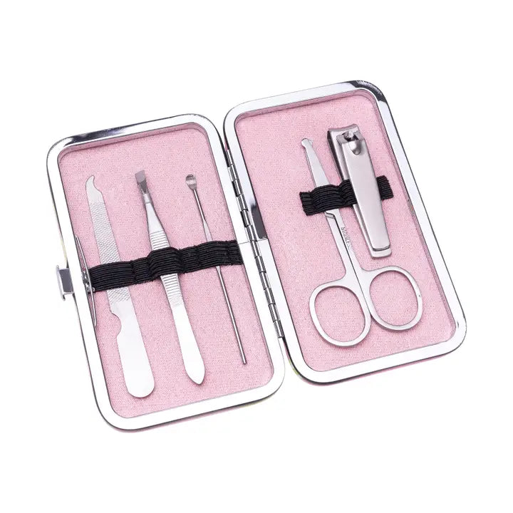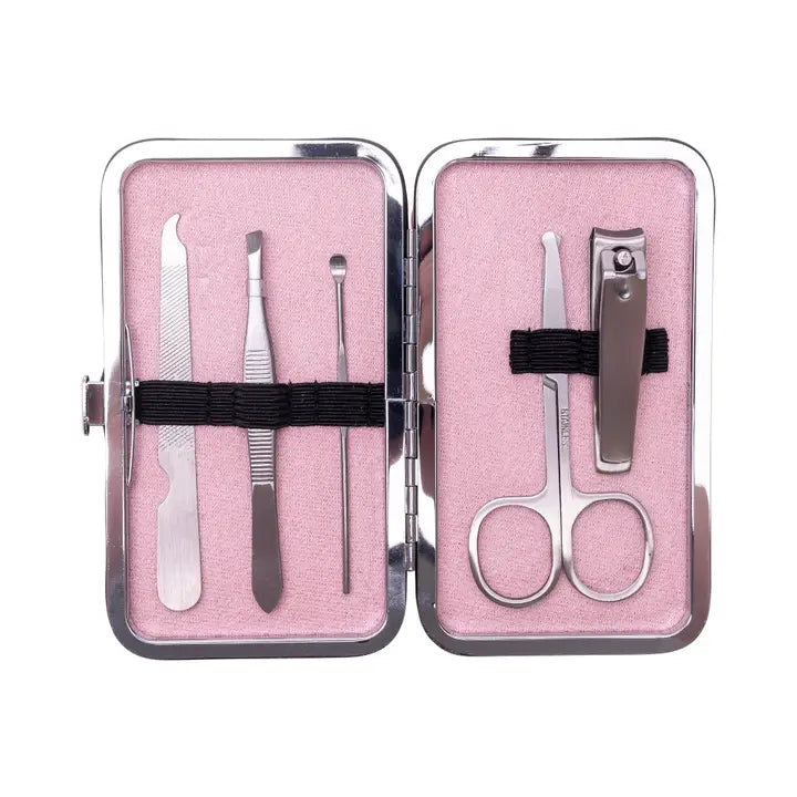 Manicure set with 5 stainless steel tools (nail file, tweezers, cuticle tool, nail clippers, cuticle scissors) in a durable PU case. Stylish and portable for on-the-go use.