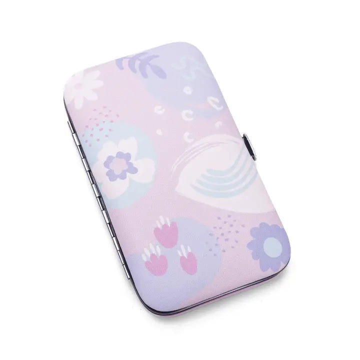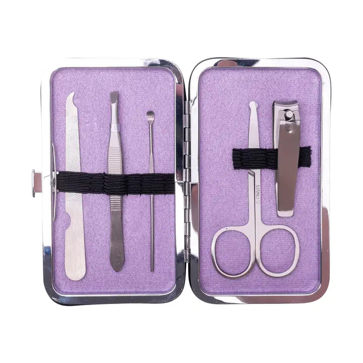 Manicure set with 5 stainless steel tools (nail file, tweezers, cuticle tool, nail clippers, cuticle scissors) in a durable PU case. Stylish and portable for on-the-go use.