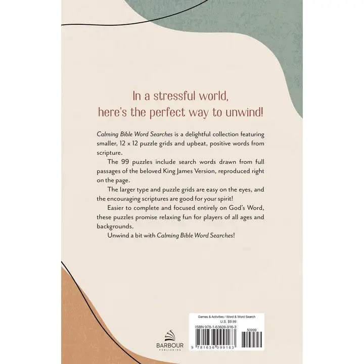 Calming Bible Word Searches is a brand-new collection featuring smaller, 12 x 12 puzzle grids and upbeat, positive words from scripture.
