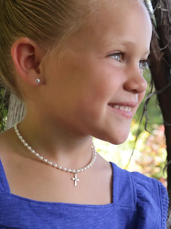 14K Gold-plated (over sterling silver) white simulated Austrian pearl stud earrings - classic and timeless! These gorgeous earrings have screw backs that are so nice for children and stay put so she won't lose them. They are hypoallergenic, and nickel free so they will not irritate sensitive ears. These come in a darling gift box!