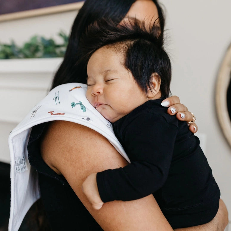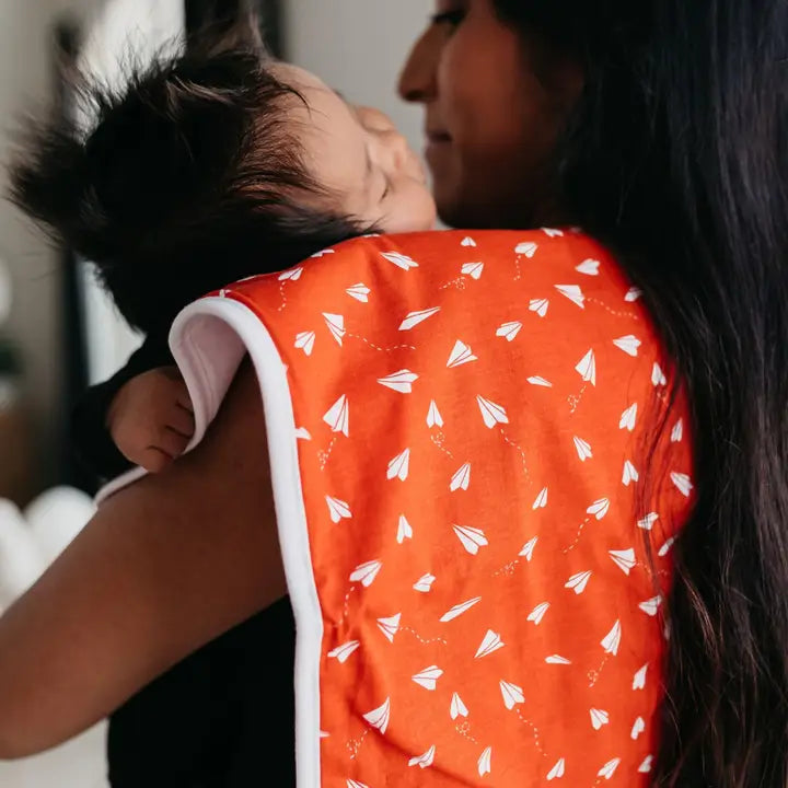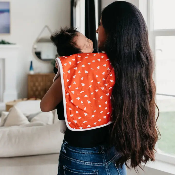 * Our burp cloths are designed with baby’s comfort in mind. That’s why we created them with 100% ultra-soft cotton layers on the front (patterned) and back (plain white). You can feel confident that baby will feel cozy against your shoulder while burping.