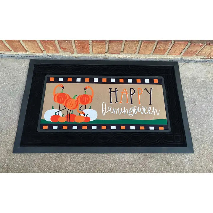 Flamingoween. Attractive and inspiring, this doormat insert fits perfectly into the doormat base to create a look you will love; this doormat insert fits snugly side to side, with a little gap on the top and bottom, so as not to create a tripping hazard. Made with mildew-resistant polyethylene terephthalate fibers, it helps to quickly clean and dry shoes. Rubber backing holds insert firmly in the base. Size of insert is approximately 22x10. Insert only - doormat base tray sold separately.