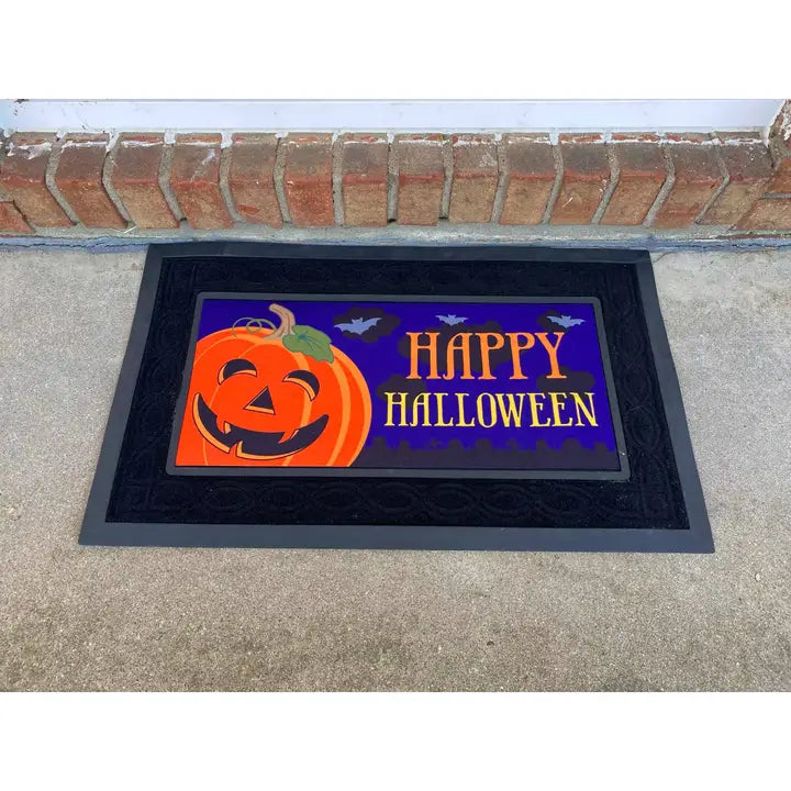 Halloween. Attractive and inspiring, this doormat insert fits perfectly into a doormat base to create a look you will love; this doormat insert fits snugly side to side, with a little gap on the top and bottom, so as not to create a tripping hazard. Made with mildew-resistant polyethylene terephthalate fibers, it helps to quickly clean and dry shoes. Rubber backing holds insert firmly in the base. Size of insert is approximately 22x10. Insert only - doormat base tray sold separately,
