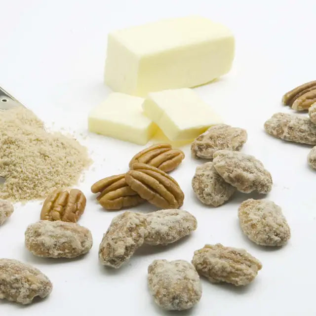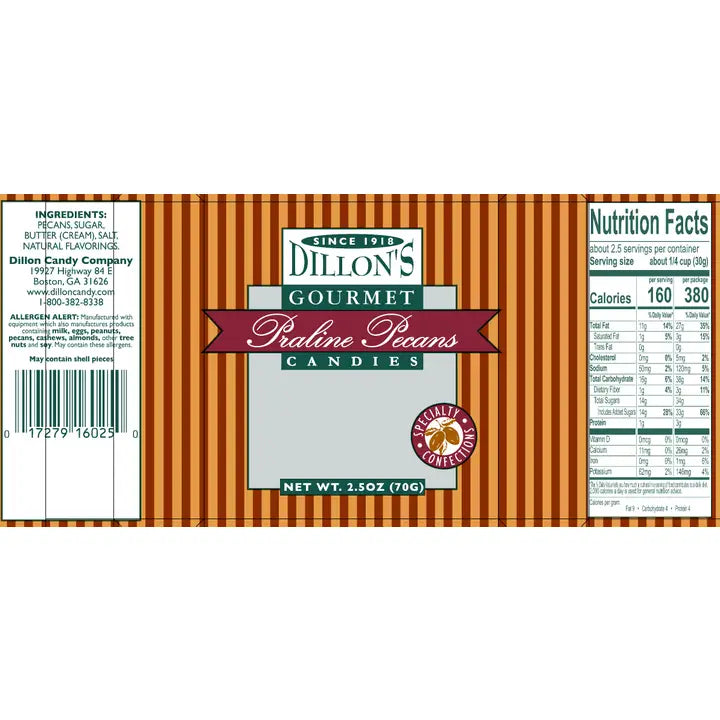 Praline pecans consist of fancy pecans coated with a buttery, praline candy, a traditional confection of the coastal South. Each candy unit is individually packaged in a clear tray and wrapped in a high barrier flexible Dillon labeled film bag.