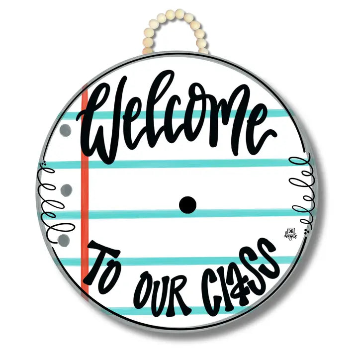 DK Notebook Welcome to our Class w room for a mini is a UV Printed Door hanger measuring 23" round that is perfect for indoor or outdoor use. All original designs are printed on a moisture resistant high quality 1/4" board and sealed for additional protection with 2 coats of a gloss finish. DK hangers come with a fully wired beaded handle. All products are designed, and manufactured in Forsyth, Georgia.