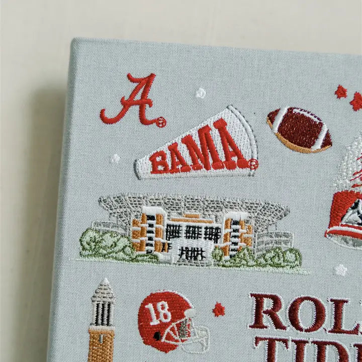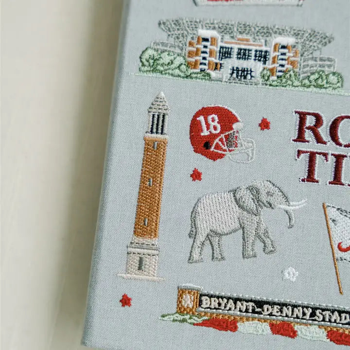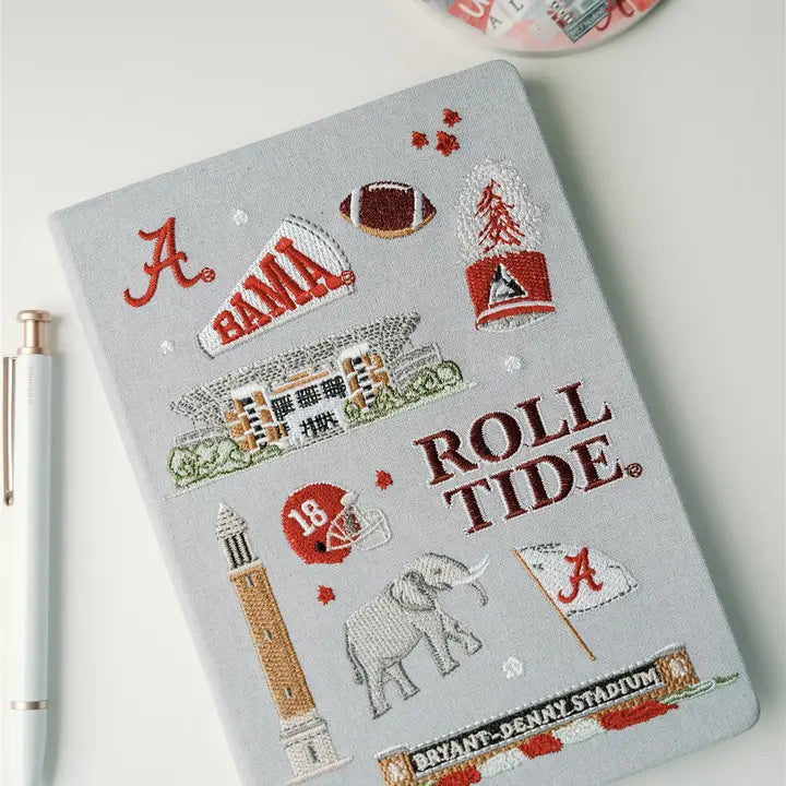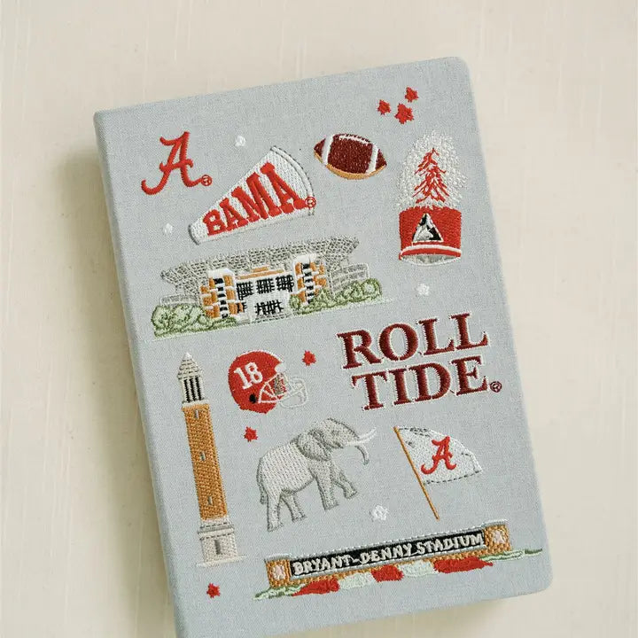 This 5.5x8 inch linen hardcover journal features embroidered icons representing Alabama traditions! Bryant-Denny Stadium, Big Al, Denny Chimes, a Million Dollar Band hat, and more!