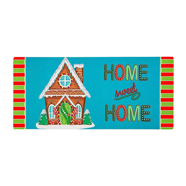 Welcome everyone from the family to Santa Claus himself home with this Sassafras switch mat. It features a charming gingerbread house decked out in frosting and candy. The red and green checkered border brings and Home Sweet Home message add festive flair to this mat. Crafted from heat-sublimated polyester with a rubber backing, this versatile mat is designed to fit perfectly within Evergreen's switch doormat bases. The mildew resistant mat is ideal for indoor or outdoor use and features a skid-resistant backing to help keep it in place. This welcoming mat will freshen up your stoop season after season while ensuring your home stays debris-free. For stains, simply spot clean with soap and warm water.