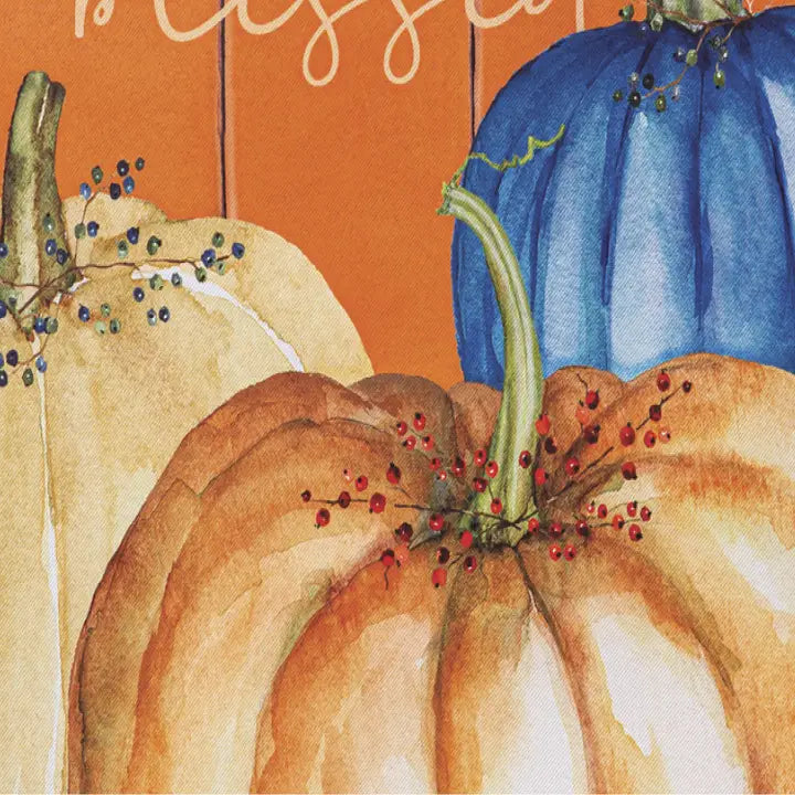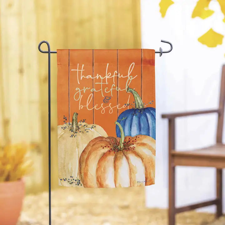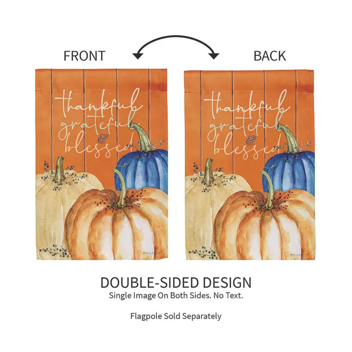 Welcome friends and family to the home with this suede garden flag. It features three pumpkins against an orange background with a Thankful, Grateful, Blessed message to greet visitors. The eye-catching artwork is carefully heat transferred onto sun-blocking material, resulting in beautiful, high-quality finished product. Each Suede Reflection flag is made of weatherproof material that is soft yet durable. Our attention to detail and level craftsmanship ensure that the flag wont fade or fray, even with continued outdoor use.