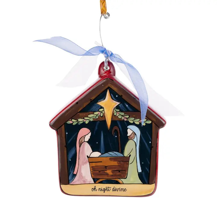 This beautifully crafted Nativity Puff Ornament captures the heart of Christmas with a serene nativity scene featuring Mary, Joseph, and baby Jesus under a shining star. The intricate design, complete with a blue ribbon, highlights the peaceful moment of the Holy Family surrounded by soft colors and a festive "Oh Night Divine" message. This ornament brings a spiritual touch to your holiday tree, making it a perfect keepsake or gift for those who cherish the true meaning of Christmas.
