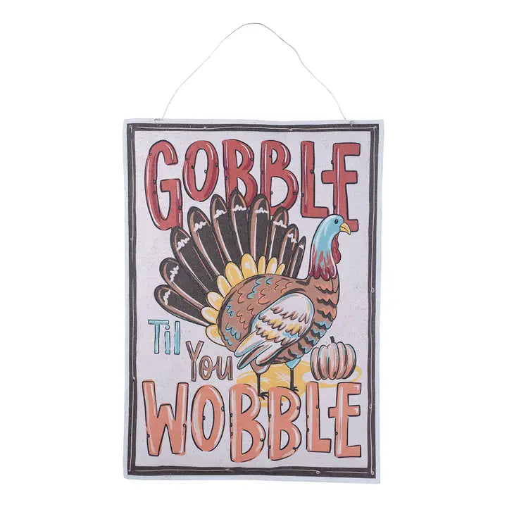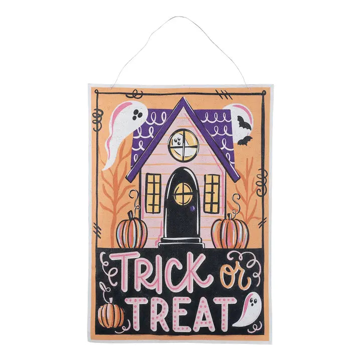 Celebrate two holidays with one charming reversible burlee. Featuring a spooky Trick or Treat House on one side and a festive Gobble Til You Wobble turkey on the other, this versatile door hanger seamlessly transitions from Halloween to Thanksgiving. Made with durable materials and vibrant, hand-painted designs, this burlee is perfect for welcoming guests all season long. Simply flip it over for instant holiday magic.