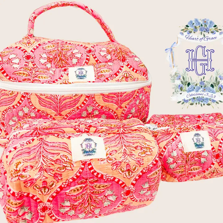 Heart of Grace Pink Trellis Dream Quilted Cosmetic Bags-Set of 3