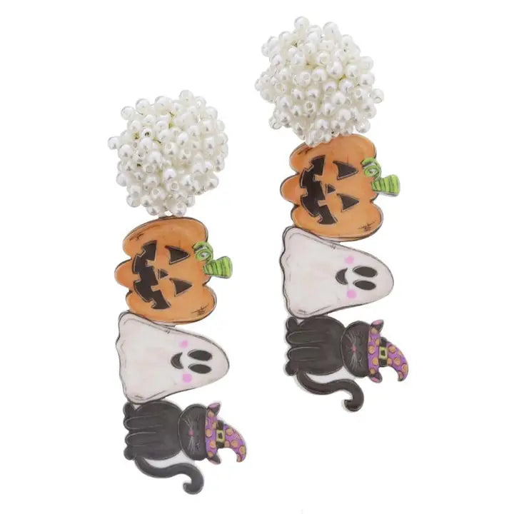 Welcome the spooky season in style with Jane Marie's Pearl Pom Post & Jack-O-Lantern, Ghost, Cat Earrings. Measuring 3.25" from top to bottom, these dangle earrings are a delightful treat for sure! They effortlessly combine whimsical charm with a fashionable edge, making them an essential addition to your Halloween accessory collection. Whether you're heading to a party or handing out candy, these earrings will surely make a statement.