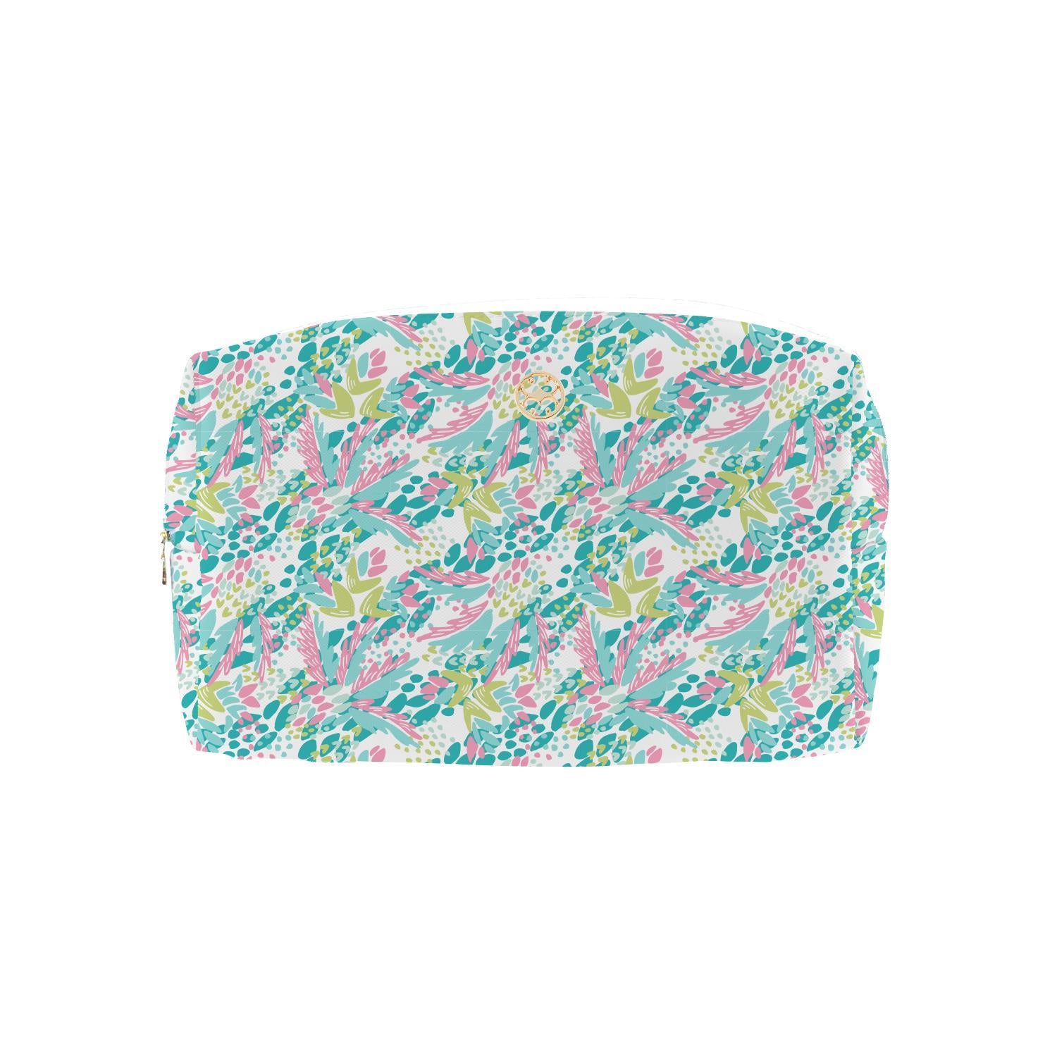 Introducing the Let's Face It Bag—a stylish and functional companion for all your makeup and toiletry needs! With a vibrant printed exterior and a sleek solid interior, this bag keeps your essentials organized and easily accessible. The gold metal hardware adds a touch of elegance, making it a perfect addition to your beauty collection.