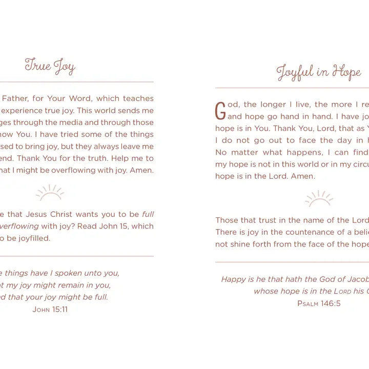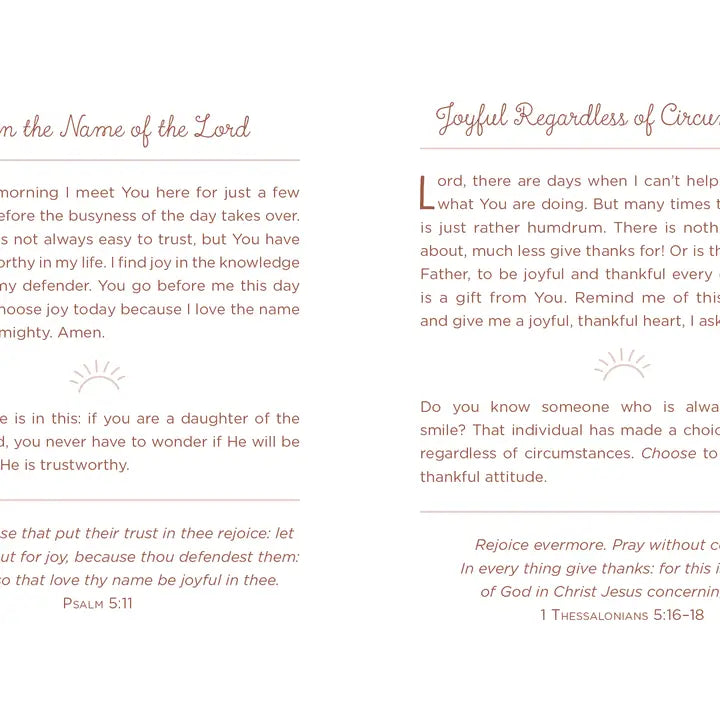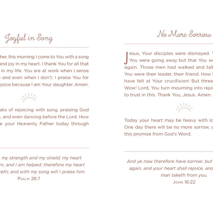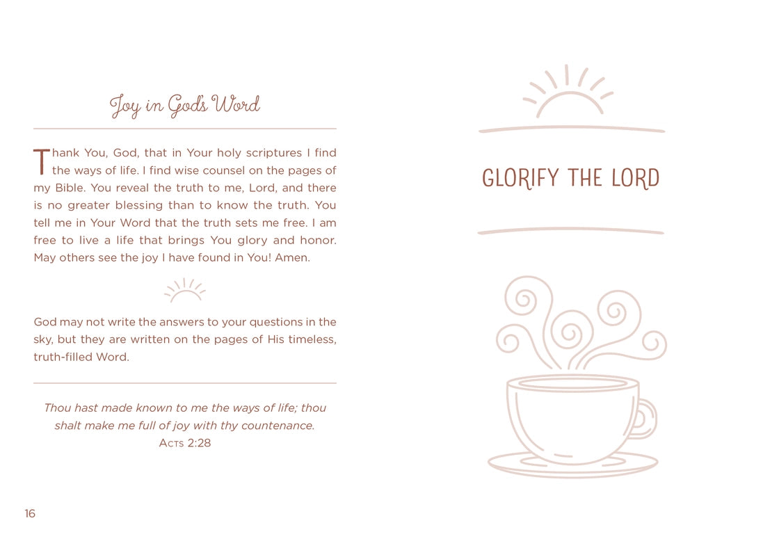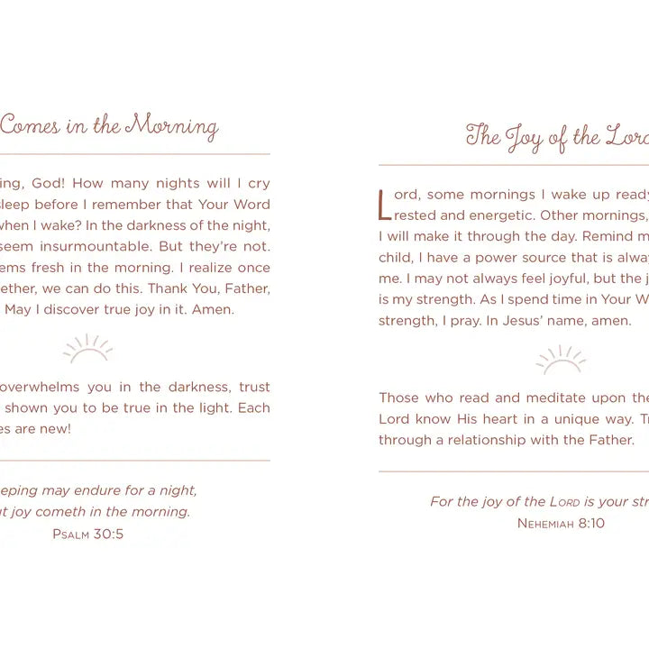 What better way to guarantee a good morning than to spend time in prayer? Mornings with God encourages women to do just that to set aside a few minutes each day for quiet time with God. Dozens of topically arranged, faith-building prayers are accompanied by inspiring devotional thoughts and scripture selections from the beloved King James Version of the Bible. The just-right-sized readings will fit perfectly into the busy morning routines of women of all ages, promising a great start to any day of the week! 4.25" x 6".