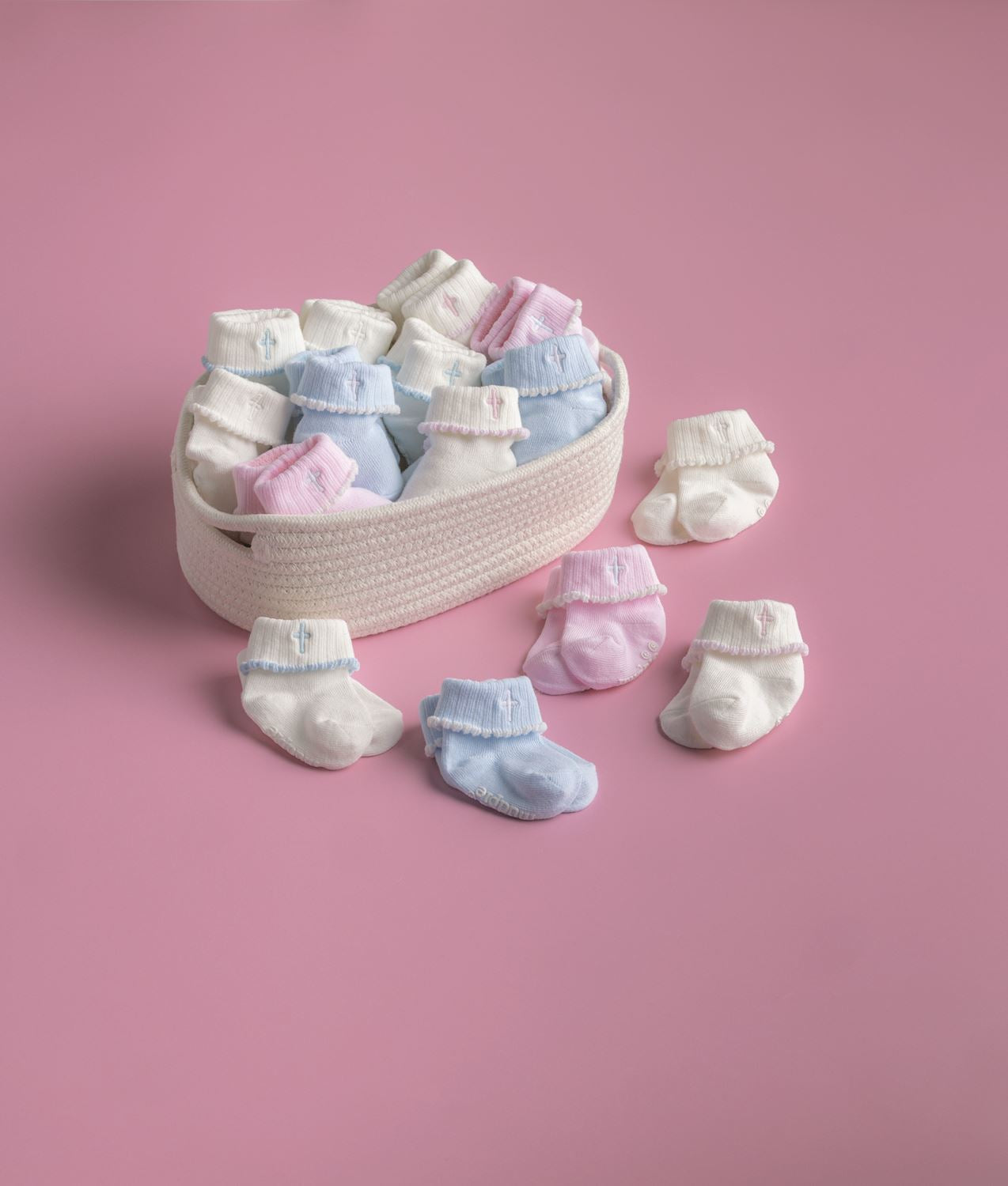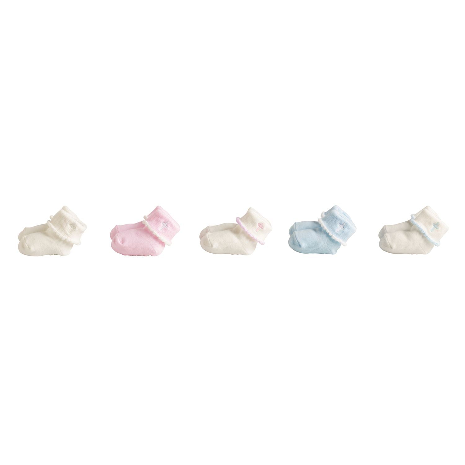 Cotton hosiery socks feature embroidered cross foldover cuff with popcorn edge.