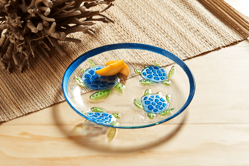 Glass Turtle Platter. This exquisite hand-painted glass platter features a stunning turtle design, perfect for adding a touch of elegance to any table setting. With a diameter of 12 inches, it offers ample space for serving appetizers, desserts, or main dishes. The vibrant colors and intricate details make it a standout piece for entertaining guests or as a decorative accent in your home. Crafted from high-quality glass, this platter is both durable and beautiful, making it a versatile addition to your dining collection. Ideal for ocean-themed decor or as a unique gift for turtle enthusiasts.