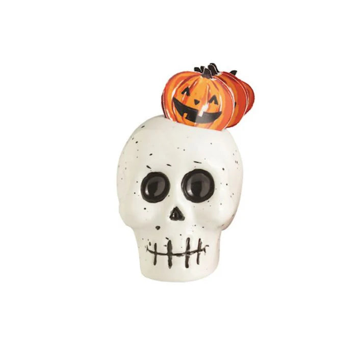 Serve up spooky style with this hand-painted speckled skull toothpick holder, complete with six themed paper-topped picks. A fun, festive accent for your Halloween snack spread.