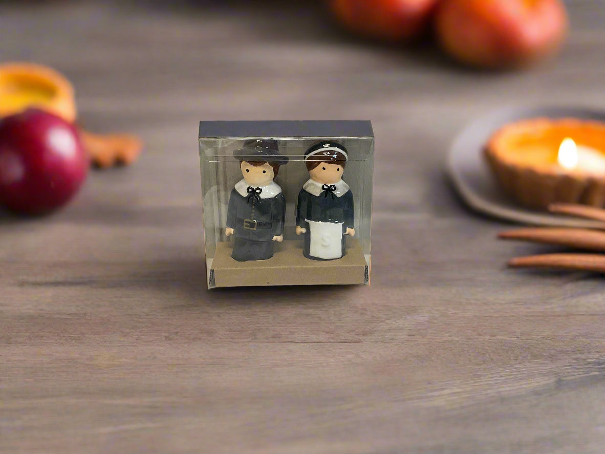 Enhance your dining experience with this charming Pilgrim Salt and Pepper Set, featuring two intricately hand-painted ceramic shakers designed in the shape of classic pilgrims. Each piece measures 3 1/2" x 1 1/2", making them the perfect size to complement your table setting without overwhelming it. Crafted from high-quality dolomite, these shakers are not only durable but also add a touch of elegance and whimsy to your kitchen decor. Ideal for Thanksgiving gatherings or as a unique gift for collectors, this set brings a festive and historical flair to any meal.