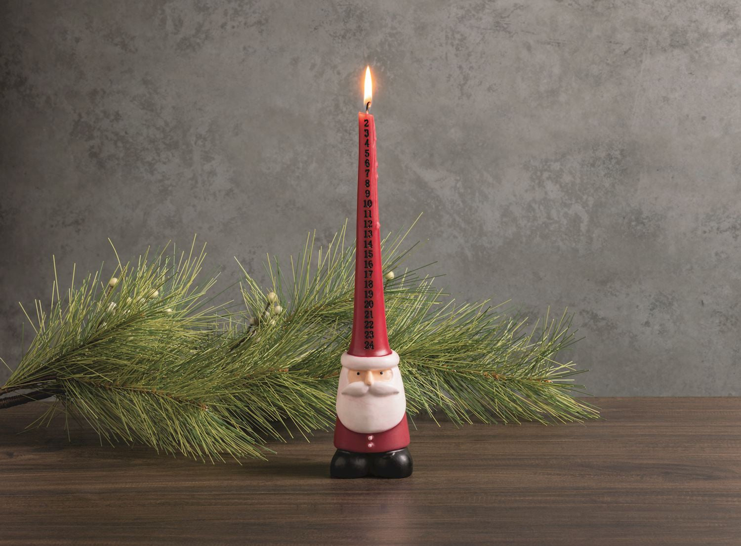 Ceramic Santa holds numbered wax taper candle. Light the candle each day to count down to Christmas.