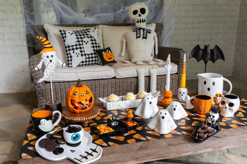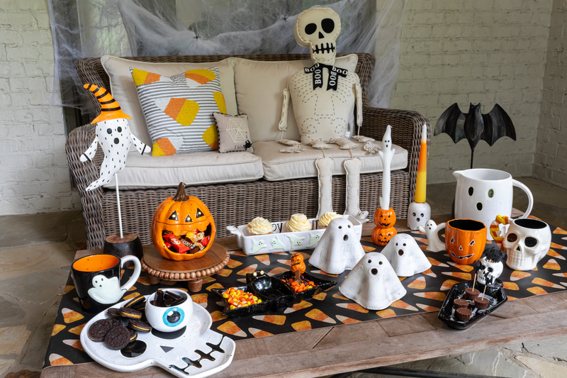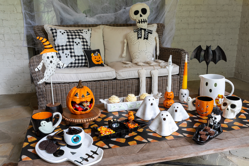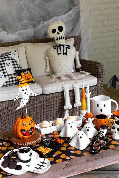 The Skeleton Tray & Toothpick Set is a 3-piece set that adds a touch of whimsy to your dining table or kitchen. The hand-painted speckle ceramic tray measures 9 1/2" x 4 3/4" and comes with a figural caddy dish that is 1 3/4" x 1 1/2" in diameter. The caddy dish is designed to hold the included pack of paper-topped toothpicks. Made of durable dolomite, this set is both functional and decorative. The skeleton design adds a playful and spooky element to your serving and entertaining essentials. Perfect for Halloween parties or adding a touch of fun to everyday meals.