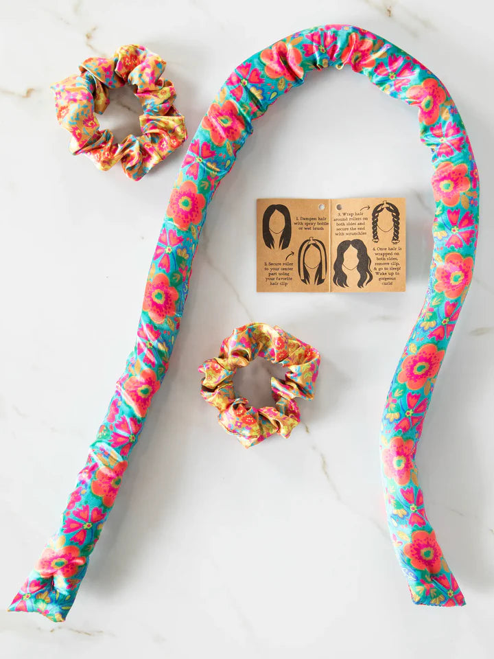 Save yourself time getting ready in the morning when you use the Heatless Hair Curler overnight! This comes as a floral-printed set, which includes one satin dark teal curling rod and two satin scrunchies. Plus, it's super easy to use - no heat required! Just separate your wet or damp hair into two sections, wrap it around the curling rod, secure at the ends with the scrunchies, and head off to bed (don't worry, we included instructions on the packaging)! Wake up and unravel your hair to reveal beautiful curls! Add this heatless curling set to your nighttime routine, and grab an extra as a cute gift for your friend!