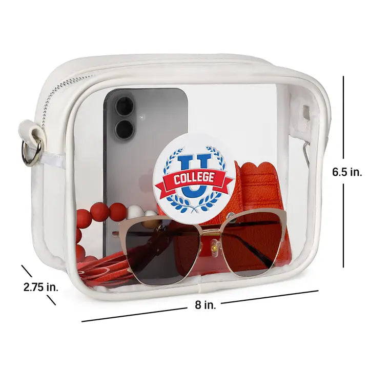 Stay stylish and game-day ready with the Clear Fanny Fan Purse, a versatile accessory that can be worn as a fanny pack or belt bag for hands-free convenience. Designed to meet stadium regulations while showcasing your team spirit, this purse features a bold team pattern strap and an eye-catching 3D team logo. The leatherette zip panel adds a sleek touch, while the shiny nickel hardware enhances durability and style. Measuring H 6.3” x W 7.87” x D 2.75”, this compact yet spacious bag is perfect for carrying your essentials while representing your team with pride.