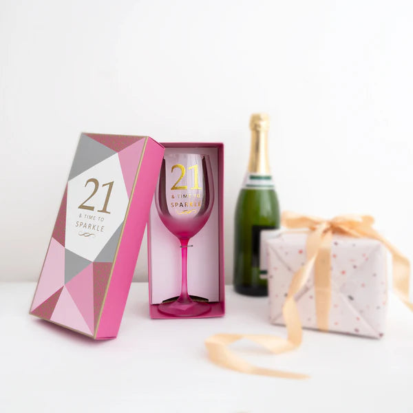 - IN-HOUSE DESIGN: Coming together with a matte pink bottom and stem that has an ombre fade into the top section of the glass with an accompanying "21 & Time To Sparkle" sparkly metallic and electroplated gold sentiment. Great for holding red, white, or rose wines, including varieties of Merlot, Riesling, Chardonnay, Gewürztraminer, Sauvignon Blanc, Malbec, Zinfandel, Pinot Grigio, and more.