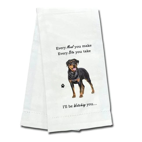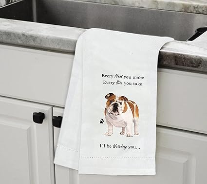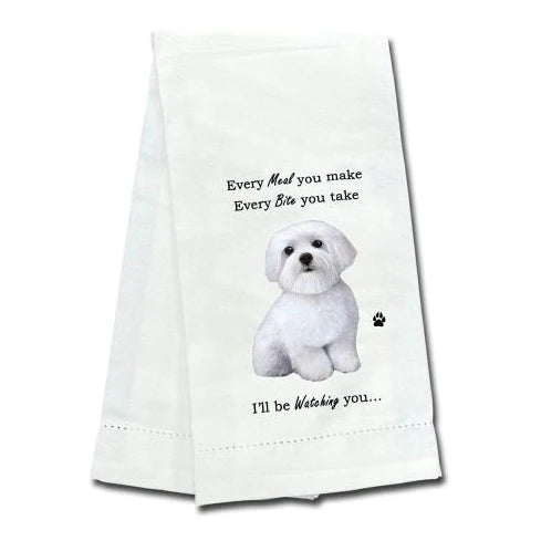 Adorable dog kitchen towels that are great for drying dishes and cleaning up. Great gift or home décor accent for any pet lover! Towel reads "Every Meal you make, Every Bite you take I'll be Watching you".