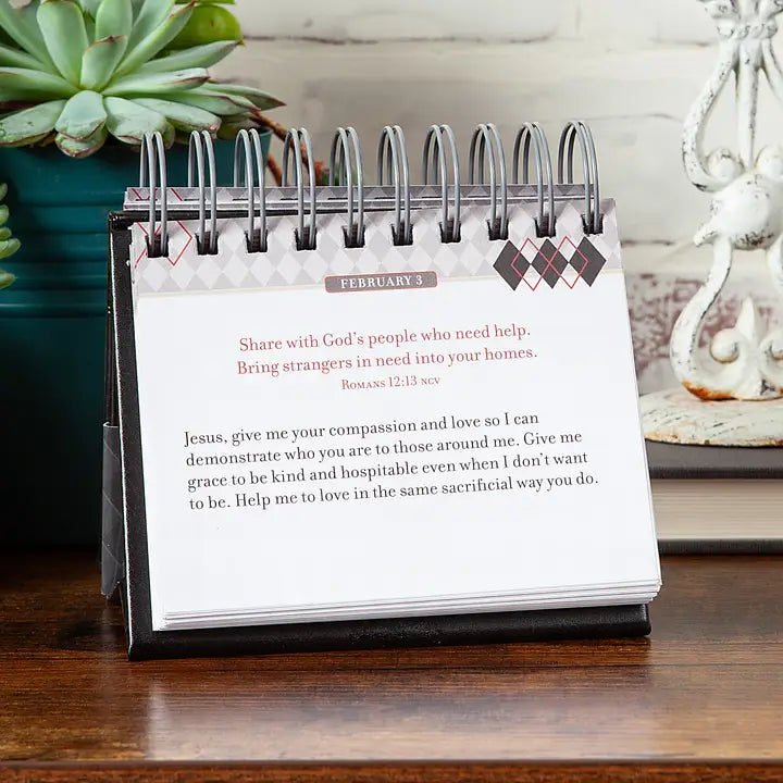 Flip through pages of encouragement every day of the year with this inspirational perpetual calendar. Themed Scriptures and heartfelt prayers help you start your day the right way—filled with wisdom and peace!