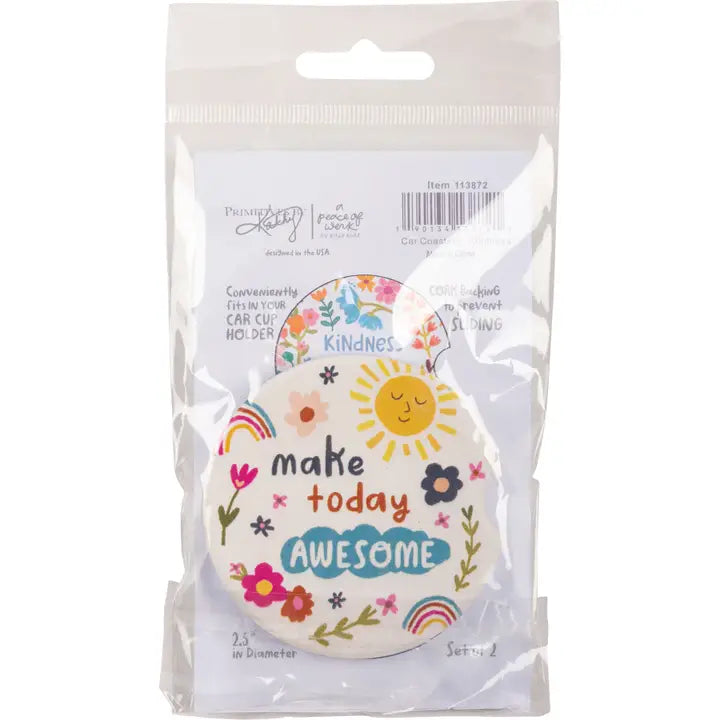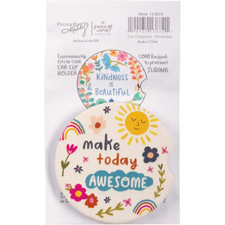 A set of two car coasters from our Inspiration & Blooms Collection features "Kindness Is Beautiful" and "Make Today Awesome" sentiments with vibrant, whimsical designs. These Kindness car coasters are made of absorbent stoneware with cork bases. Designed to fit most car cup holders.