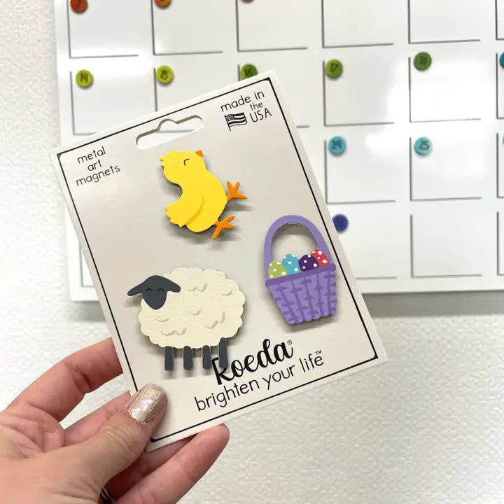 Celebrate Easter Sunday with Easter themed metal art magnets to decorate your home! This cute set includes an Easter basket, spring lamb, and baby chick. They are a fun and cute way to hang up pictures and cards, or to decorate your magnetic calendar!