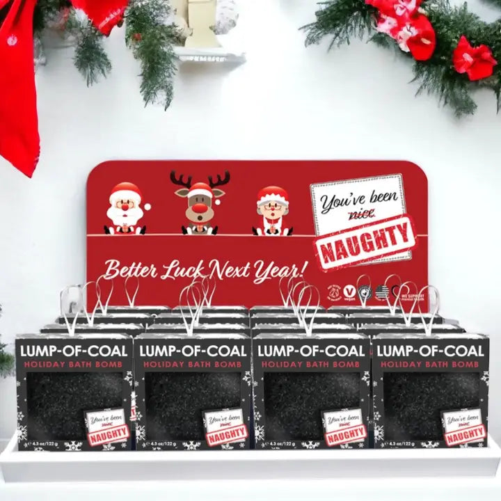 Our Lump-of-Coal bath bomb fizzes + explodes with skin softening ingredients + the holiday aroma of embers. Handmade in USA, makes a great stocking stuffer after all, even when you have been bad you deserve to feel good.