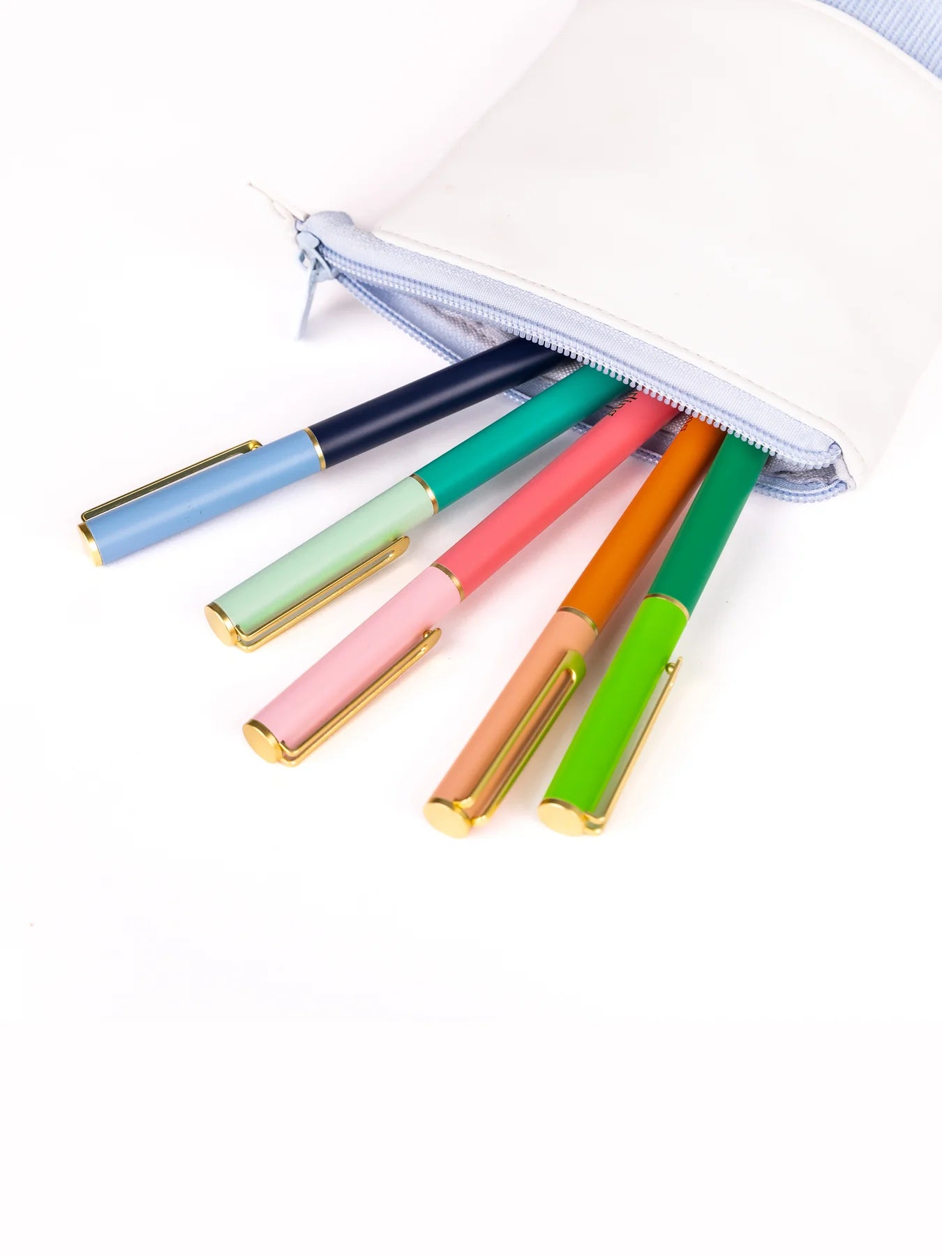 The NEW Color Block Pens are vibrant, smooth, and effortlessly stylish. With a spectrum of bright hues and a sleek snap cap design, these pens are perfect addition to any desk, notebook, or tote. Each pen features a striking color block pattern and the signature gold logo, adding a touch of sophistication to your writing experience. Elevate your stationery game with these must-have companions that turn every scribble into a delightful moment.