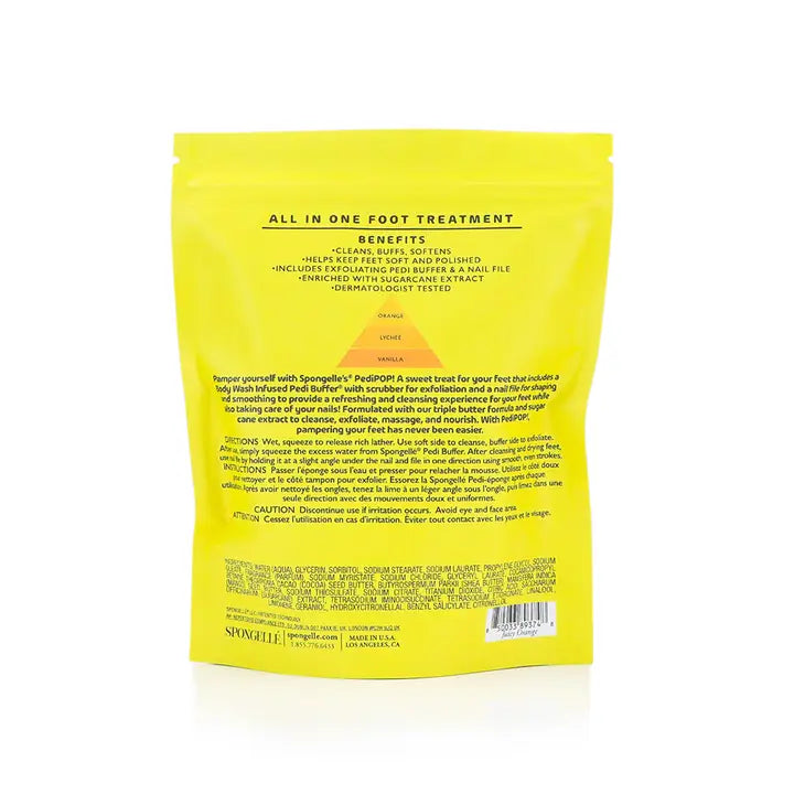 Pamper your feet with gentle cleansing exfoliation and convenient nail filling for expert grooming with our PediPOP! Body Wash Infused Pedi Buffer® in fresh Juicy Orange with inflammation-fighting vitamin C, mineral-rich lychee, and creamy vanilla. The unique popsicle-inspired combo makes shaping nails and soothing heels a refreshing experience with tender cleansing on one side and soft textured scrubbing on the other.