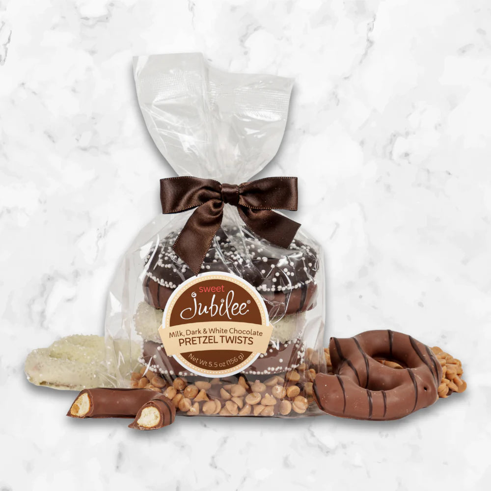 (5.5 oz) Premium Milk, Rich Dark, and Creamy White Chocolate Covered Salted Pretzel Twists with Assorted Toppings (Contrasting Chocolate Drizzle, White Nonpareils, Clear Sugar Crystals, and Peanut Butter Chips) in a Small, Clear Cello Gift Bag with a Brown Bow.