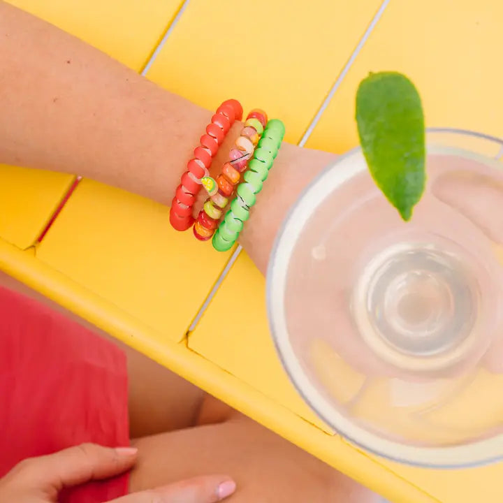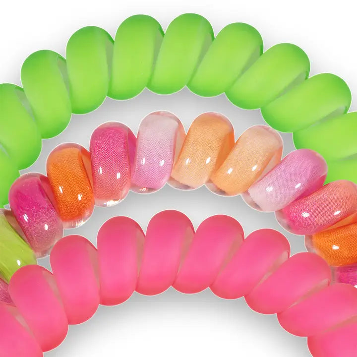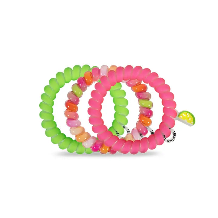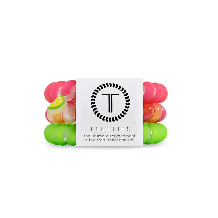 Hold your hair and enhance your style with TELETIES. The strong grip, no rip hair tie that doubles as a bracelet. Strong, pretty and stylish, TELETIES are designed to withstand everyday demands while taking your look to the next level. Sold in packs of three. The large size is 6.5cm wide x 1cm thick.