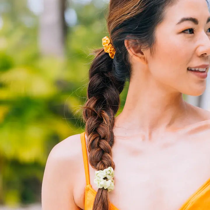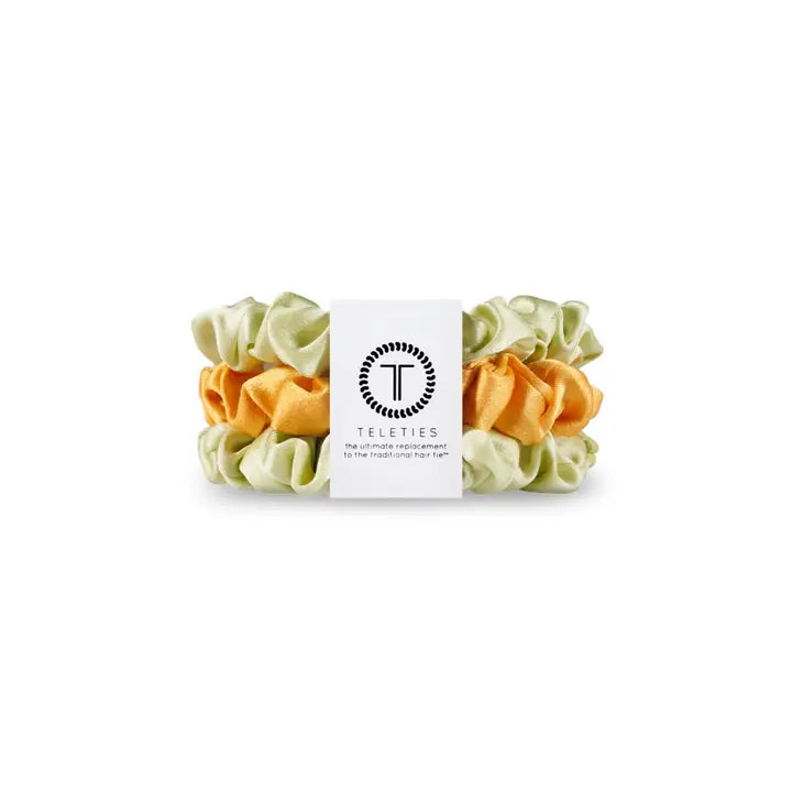 Your TELETIES just got an upgrade! The TELETIES Silk Scrunchies are made of 100% natural silk, making them super soft and gentle for your hair. It also prevents breakage and damage while you snooze. With our innovative TELETIES spiral coil inside, you get the same features of our game-changing hair ties, now covered in silk! Get ready to wake up with hip, happy and healthy hair! The small-size scrunchie is best for thin to medium-thickness of hair.