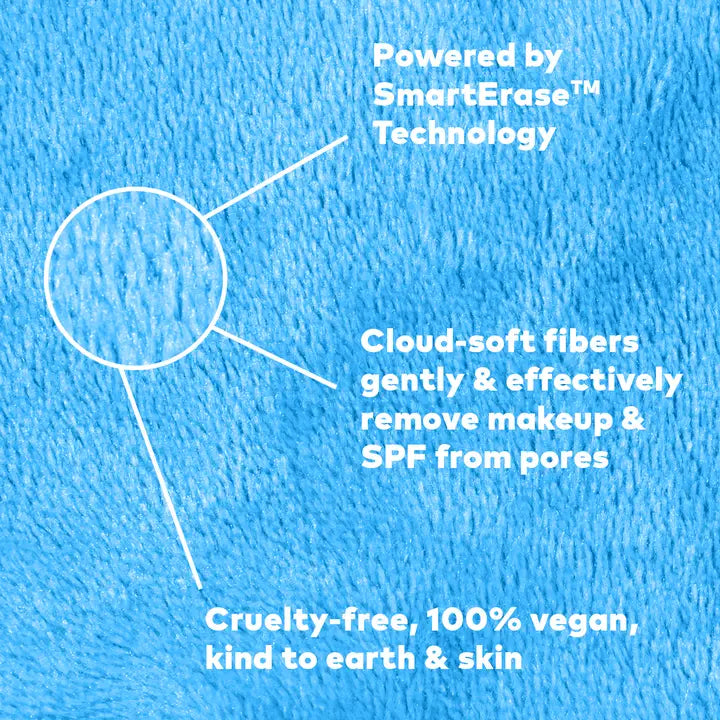 Erase all makeup with JUST WATER™ including waterproof. Our patented, water-activated, cloud-soft fibers gently & easily remove all makeup & sunscreen from pores. 2 in 1 benefit: one side erases makeup & one side exfoliates skin.