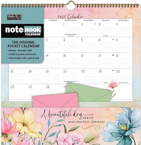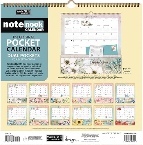 Note Nook®, the original twenty-four pocket calendar, is designed to help you stay organized all through the year! The Country Pleasures 2026 Note Nook® contains 12 months of calendar grids, decorated with seasonal artwork with uplifting sentiments by Joy Hall, each with two pockets to store coupons, bills, receipts and more!